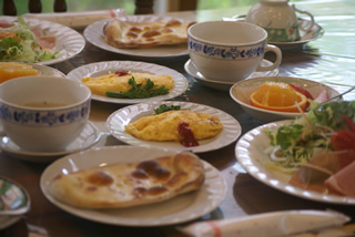 お食事は和洋折衷です。すべて手作りをモットーに新鮮野菜をたっぷり使ったボリューム満点 のお食事です。